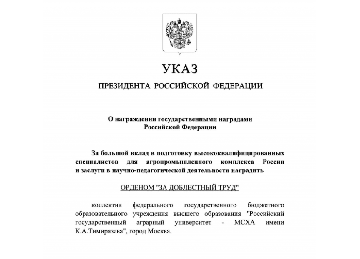 В преддверии своего 160-летнего юбилея Российский государственный аграрный университет – МСХА имени К.А. Тимирязева получил высокую государственную награду.